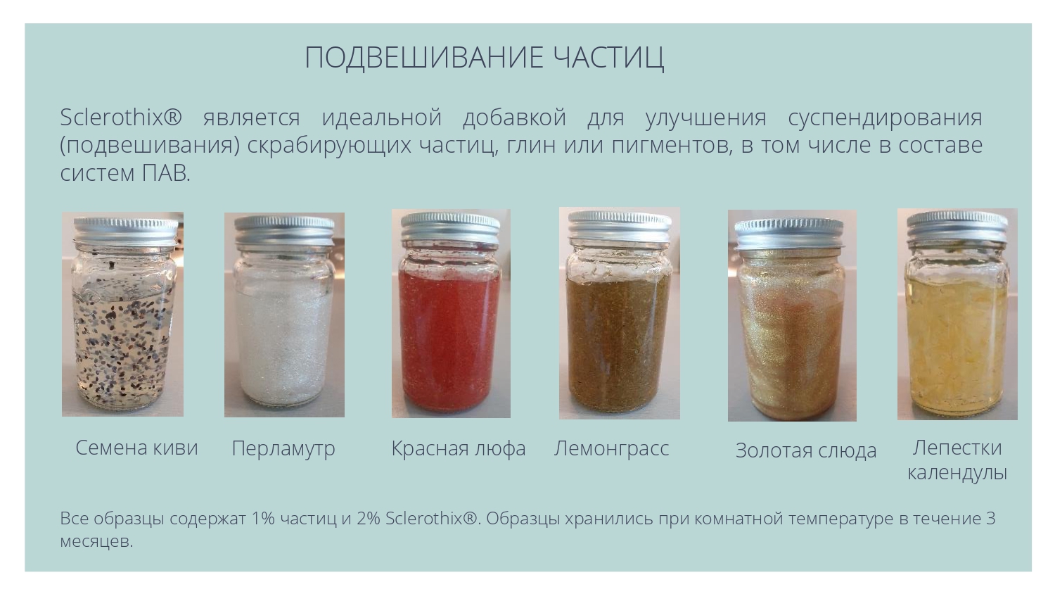 Sclerothix является эффективной добавкой для улучшения суспендирования (подвешивания) различных частиц - скрабов, глин или пигментов, в том числе в составе моющих систем.